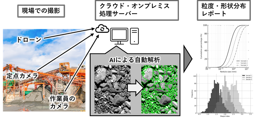 砕石・骨材の管理、盛り土や残土の処理、鉱山や砕石・採石場、防災といった現場では、土砂の性状を定量的に把握することが重要です。宮本研究室では、AIを用いた独自開発のアルゴリズムにより、数秒で無数の岩石粒子を自動識別し、粒度分布や粒子形状の分布を含む詳細なレポートを即時に出力するシステムの開発をすすめています。導入から運用支援まで、各現場のニーズに応じたご相談にご対応しております。ご興味をお持ちの方は info@seed.um.u-tokyo.ac.jp までお気軽にお問い合わせください。