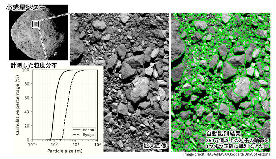 小惑星リュウグウおよびベヌーの画像約1万枚を解析し、累計350万個以上の岩石粒子を自動識別することに成功。人力では到底処理不可能な規模の解析を、前処理から後処理まで含めわずか2週間ほどで完了させました(図4)。
