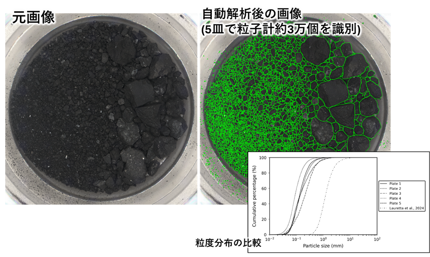 本アルゴリズムは現在、複数の宇宙探査プロジェクトで実際に運用されています。たとえば、NASAのOSIRIS-RExミッションによって2023年に地球へ帰還した小惑星ベヌーのサンプルの初期解析では、JAXAを通じて提供された5枚の試料皿の画像を数日で解析し、その結果約3万個の粒子を識別し、それらの粒径・形状分布を明らかにしました。(図6)。その解析速度と精度の高さはJAXAからも高く評価されています。