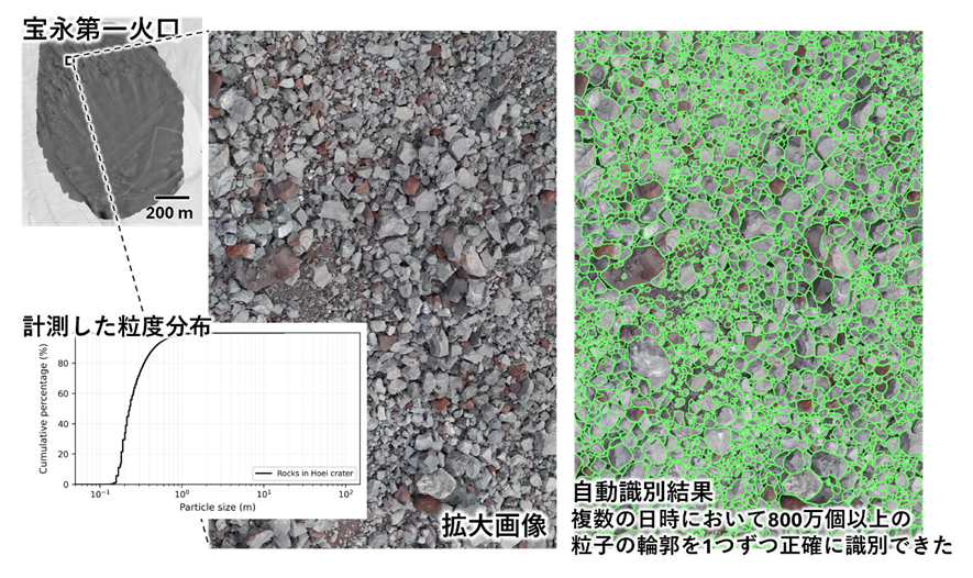 そして本アルゴリズムの真価は、地球上の利用でも一切損なわれることがありません。2022年、私たちは富士山宝永火口にて実証実験を実施し、ドローンを用いて約1.1平方キロメートルに及ぶ範囲を撮像し、800万個以上の岩石粒子を自動識別しました(図7)。
